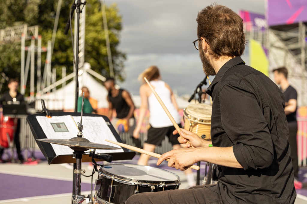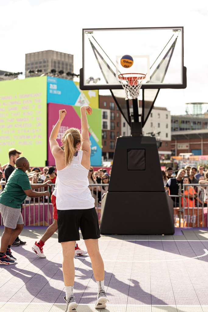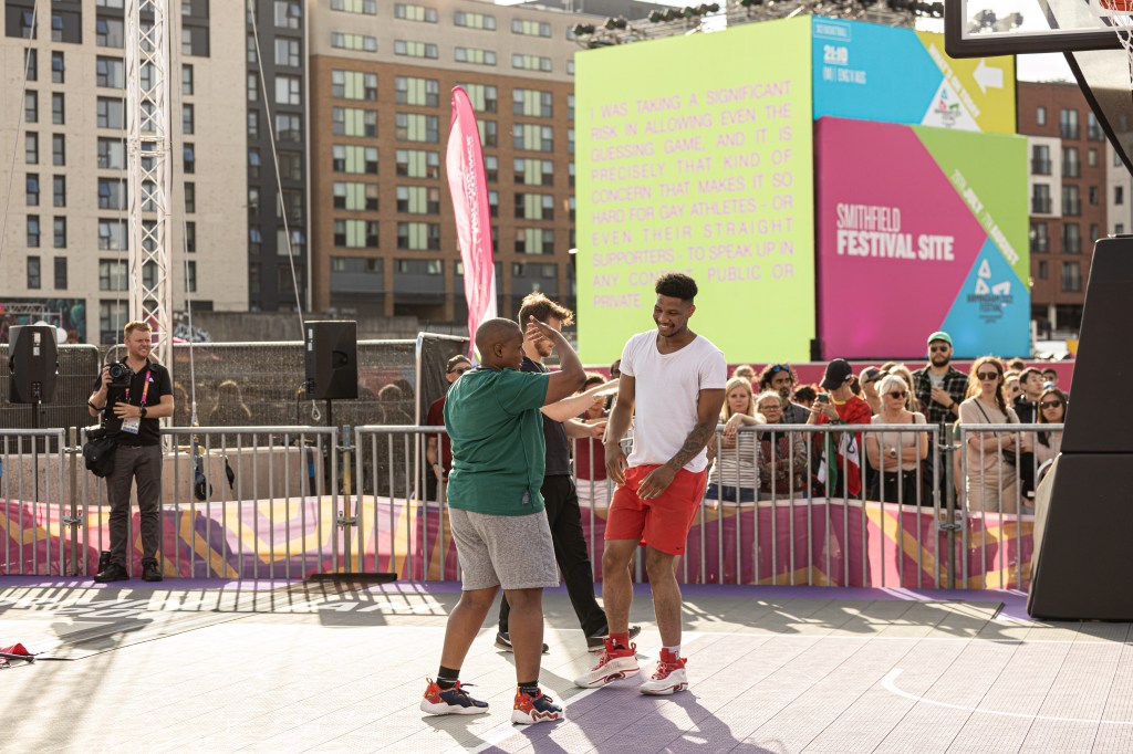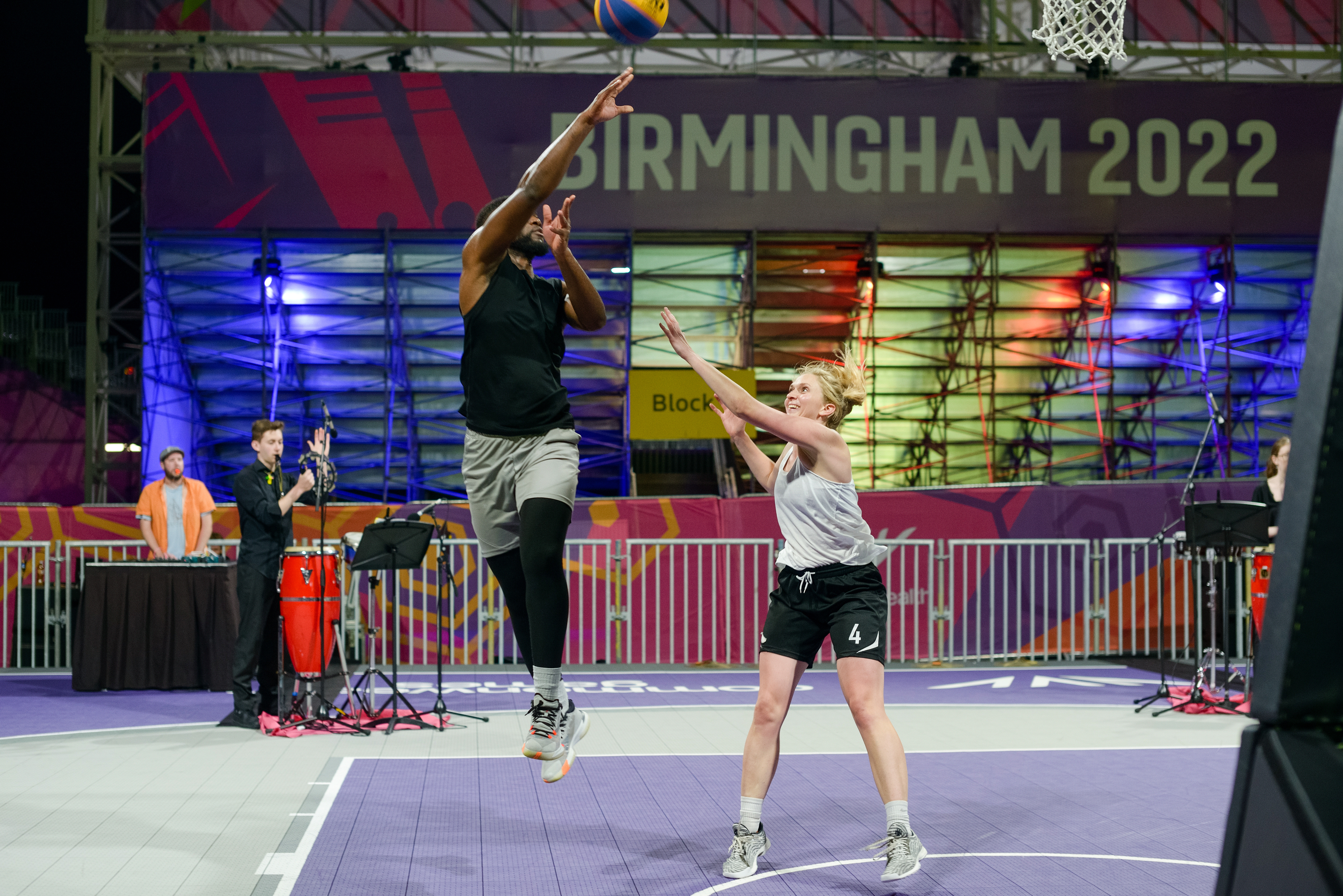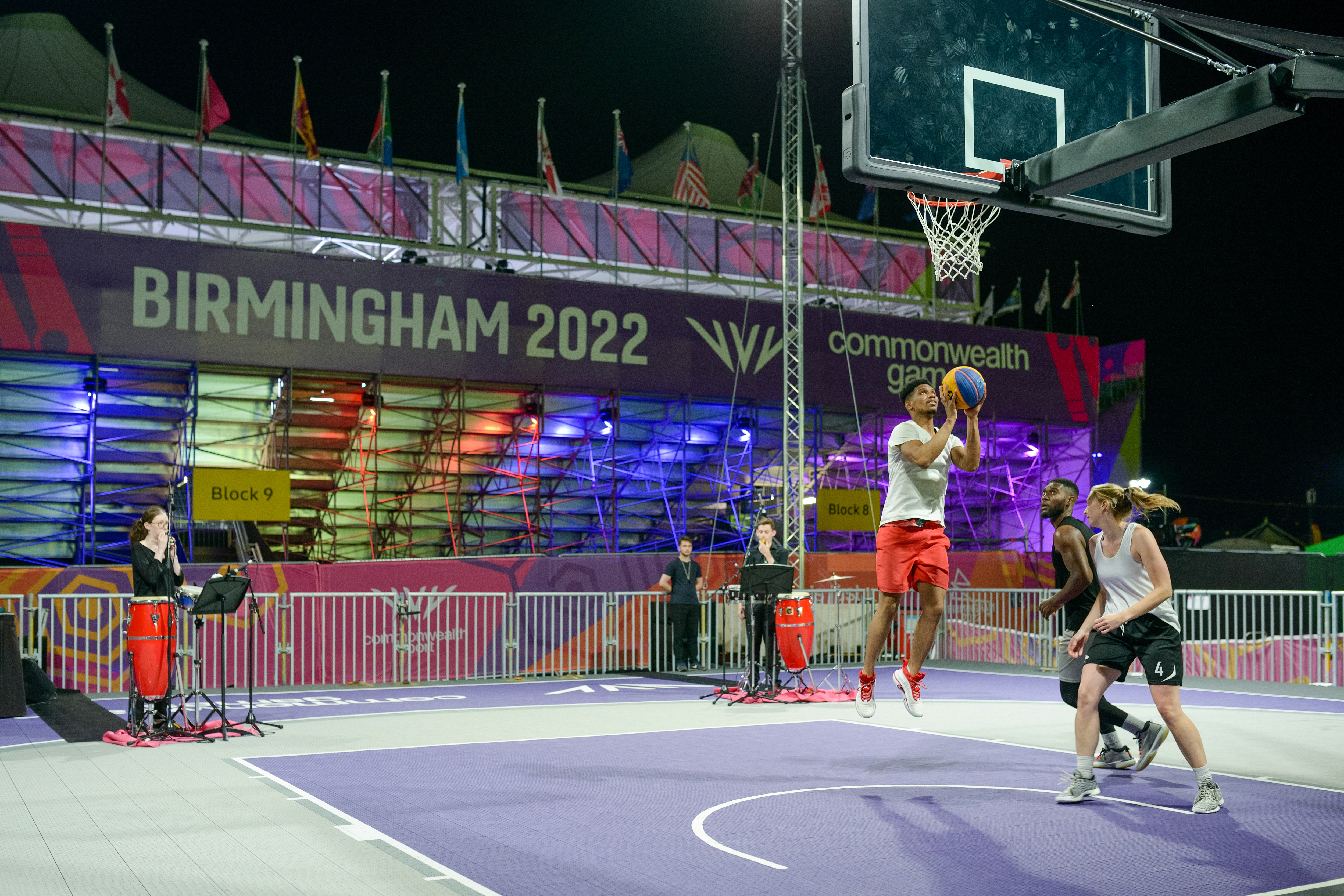 In Amaechi three Birmingham basketball players, three mobile percussionists, and an electronic musician run, jump, shuffle, bounce, and play across the 3X3 practice court of the Commonwealth Games creating an energetic and sonically rich performance that sits in the space between sport and music. This action is frequently interspersed by three singers quoting in close harmony the inspiring words of psychologist & Ex-NBA player, John Amaechi, the first basketball player to come-out as gay in the very straight world of sports. This LGBTQ+ led performance is a celebration of sport, teamwork, collaboration, difference, and the human spirit, whilst also drawing attention to the difficulties faced by queer people in sport, and the status of queer people in 35 Commonwealth countries that criminalise homosexuality, 13 of which punish homosexuality with imprisonment or death.